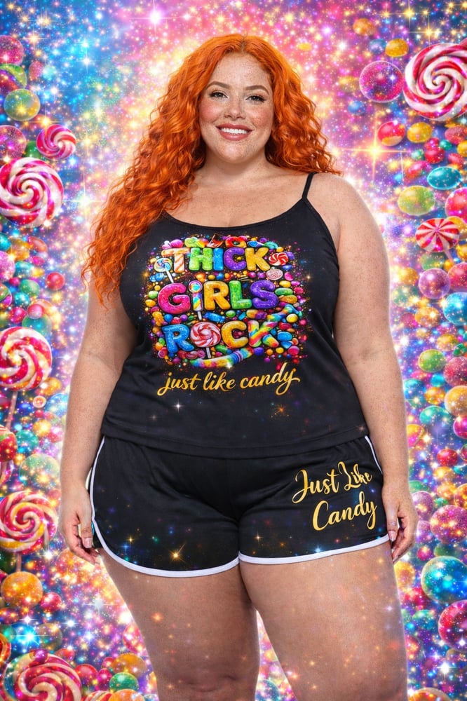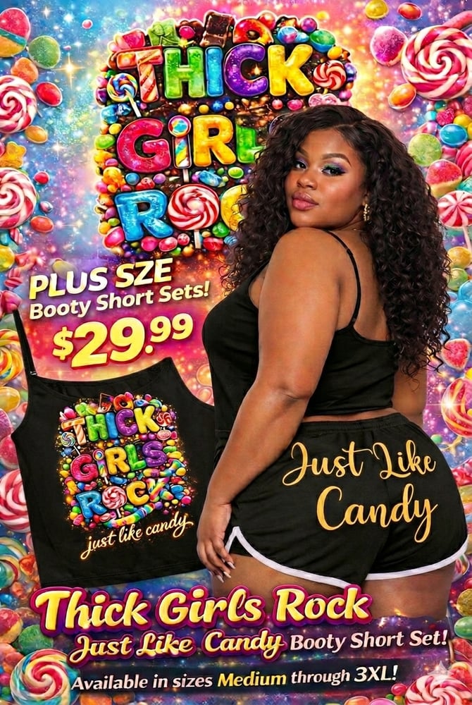 This booty short set is only available in sizes medium through 3XL the logos appear on the black tank top and the black booty shorts bottoms